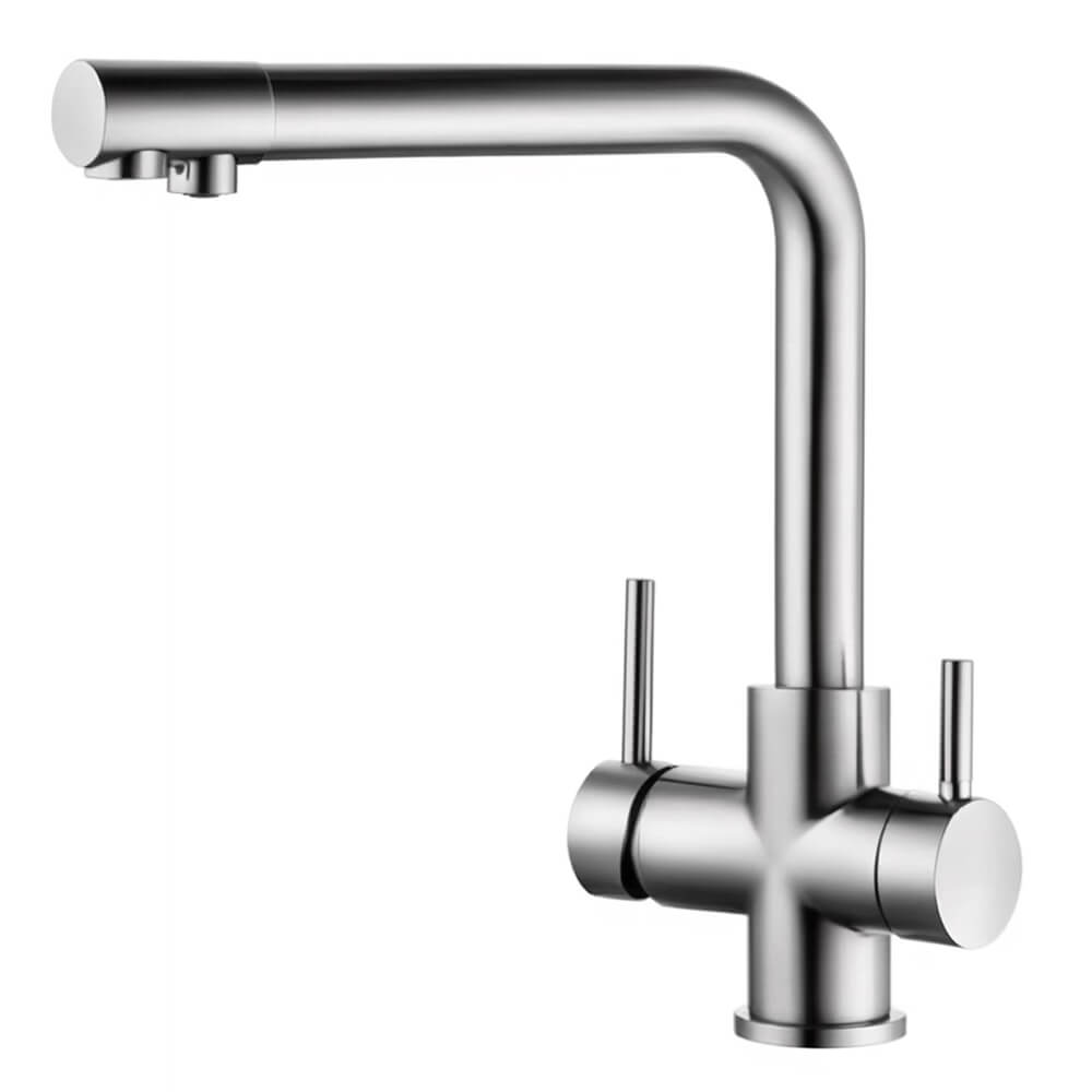 Mit seiner edlen, eckigen L-Form fügt sich dieser Wasserhahn harmonisch in jede Küche ein und spendet kaltes und heißes Leitungswasser sowie gefiltertes Wasser (z.B. Osmosewasser) – alles über ein einziges, elegantes Armaturensystem.