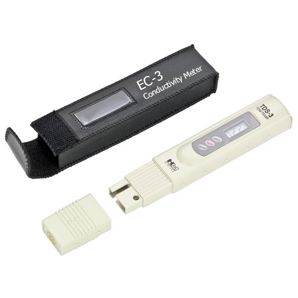 Mit diesem EC3-Messgerät können Sie die Leitfähigkeit (EC=Electrical Conductivity) messen. Gemessen wird der allgemeine Wasserreinheitsgrad. Messen Sie Ihr Leitungswasser, Mineralwasser, Osmosewasser, Regenwasser, Aquarium-Wasser etc. Das EC3-Messgerät ist ein Wassertester bzw. Leitwert Messgerät und wird einfach kurz in einem Glas mit Wasser oder direkt in das Wasser, zum Beispiel in das Aquarium, gehalten und zeigt Ihnen über ein LED-Display den genauen Leitwert in µS ( Mikrosiemens ) an. Osmosewasser oder reines Wasser haben einen optimalen Wert von ca. 10 - 30 µS.