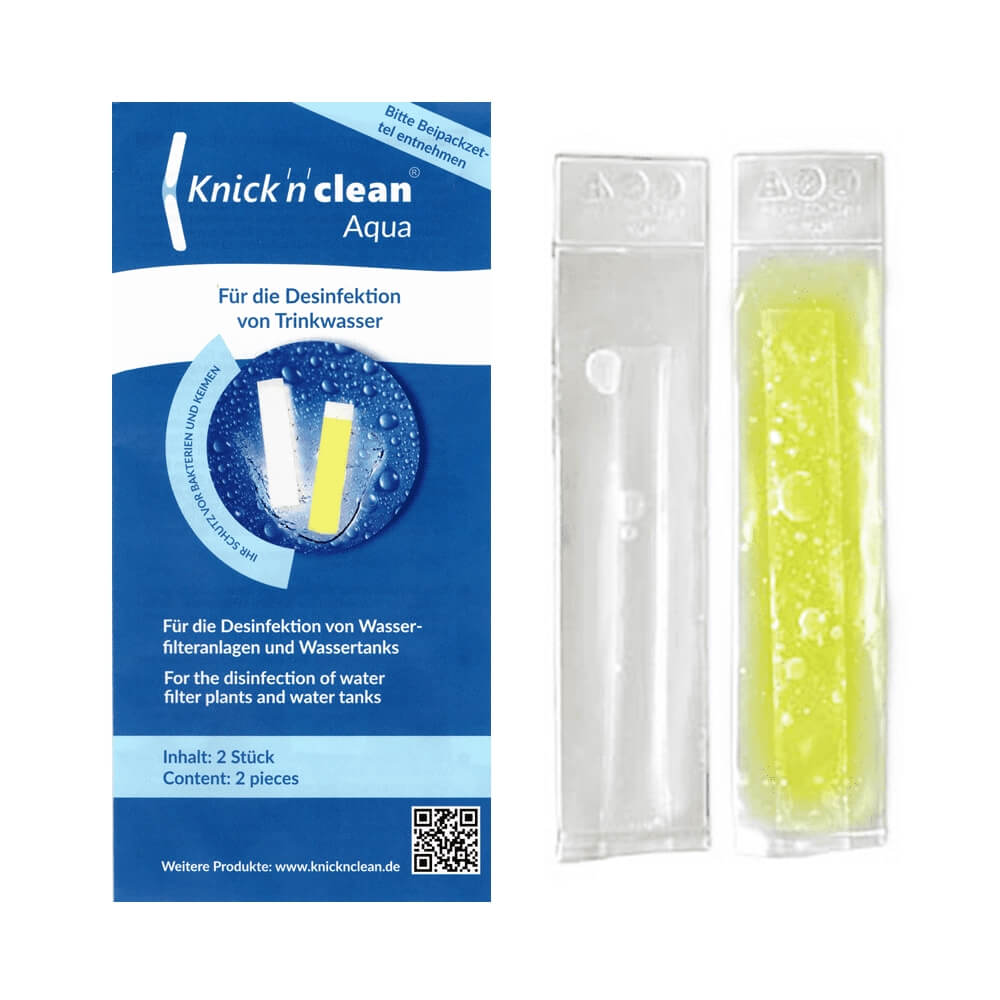 knick’n’clean® aqua ist das effektivste Desinfektionssystem für Wasserfilteranlagen & Trinkwassersysteme im Haushalt, Industrie, Camping, Boot und Caravan. Es besteht aus einem Kunststoffbeutel (mit Trinkwasserzulassung) in dem sich in getrennten Kammern zwei Flüssigkeiten befinden. Durch das Vermengen beider Flüssigkeiten, durch Zerdrücken des inneren Beutels (knick ...) direkt vor der Anwendung wird knick'n'clean aktiviert. Die volle Wirksamkeit eines aktivierten Beutels erkennt man an der Gelbfärbung.