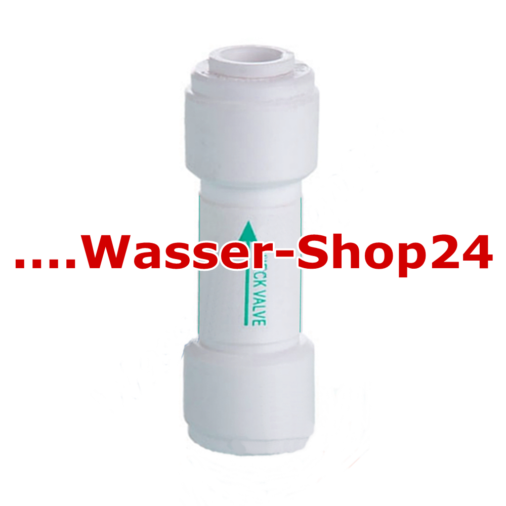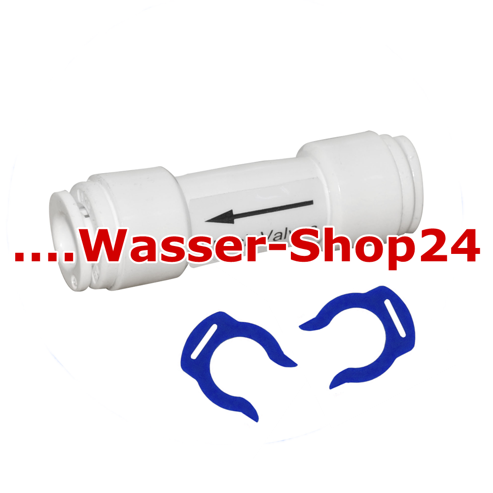 Dieses Rückschlagventil verhindert den Rückfluss von Wasser zum Gerät oder in Leitungen, wo kein Wasser zurück fließen soll. Es wird in der Regel direkt nach dem Membrangehäuse am Reinwasseranschluss installiert. Das Rückschlagventil kann aber auch zusätzlich im Abwasserbereich verwendet werden.
